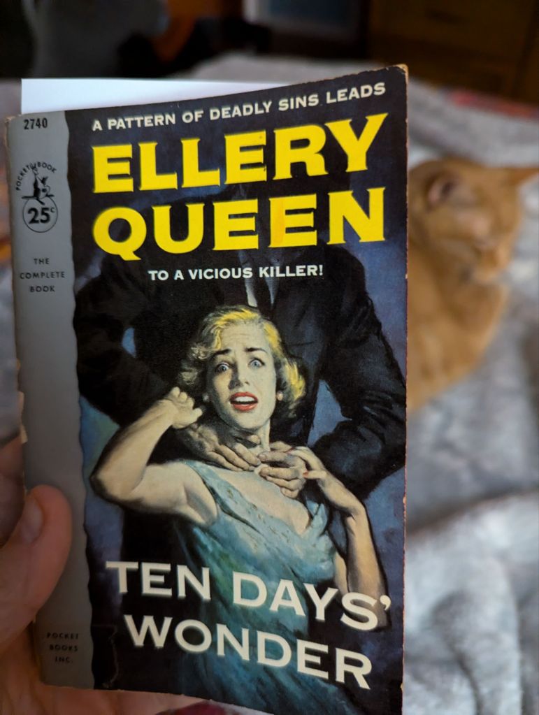 I love the artwork on these old paperbacks. I’m cheating on the Library with an analog book today. Ellery Queen is quite anodyne anyway; there wouldn’t be much to annotate. I’m just being my Boo Radley self, hiding away with my vintage paperbacks and coffee, trying to pretend like I’m not living some hellish remake of “Idiocracy” set in the Weimar Republic.